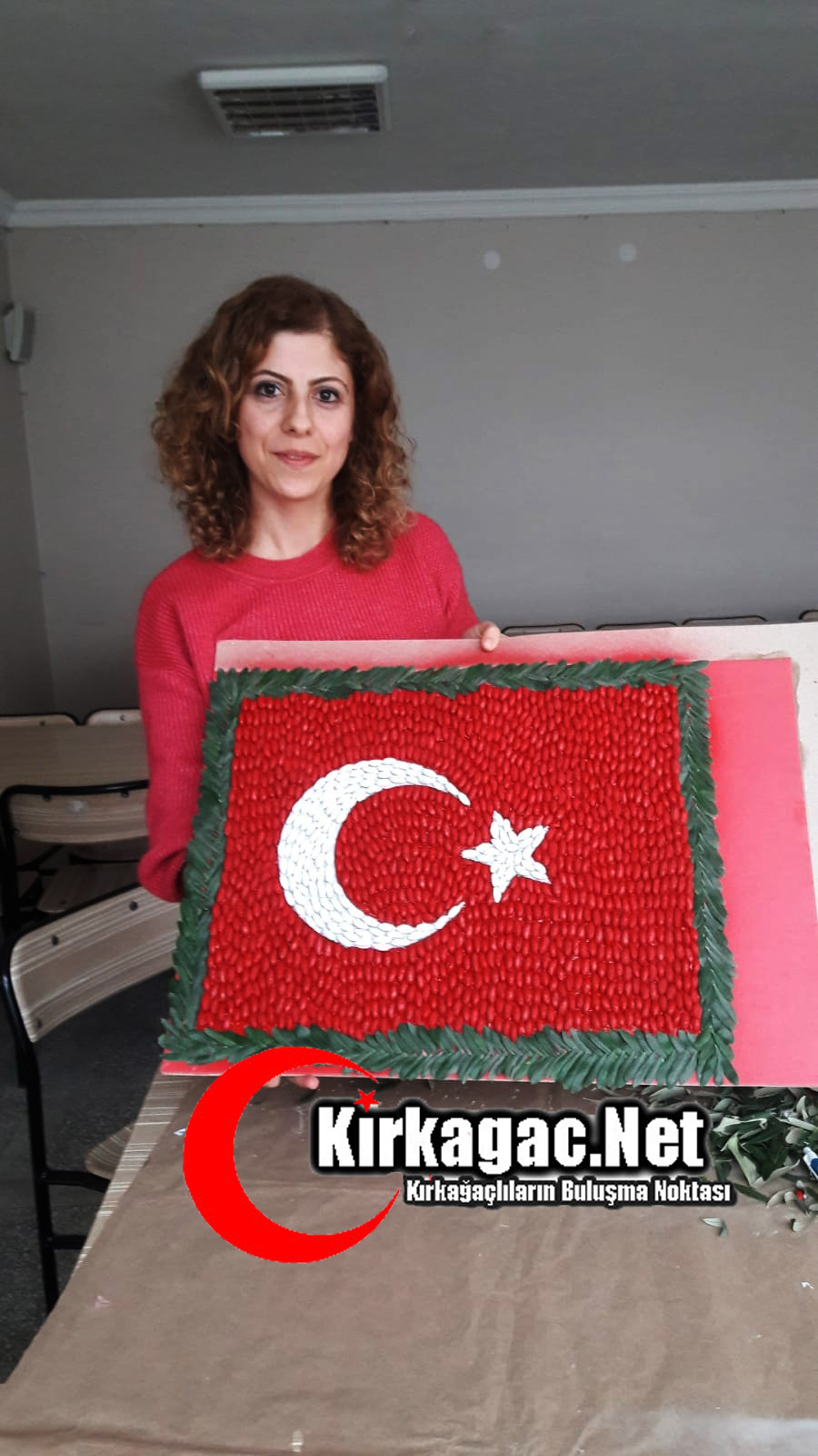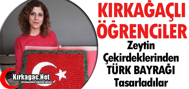 Ekinci ve öğrencileri yöremizi temsil etmesi açısından zeytin çekirdekleri ve yaprakları ile Türk bayrağı tasarladı.