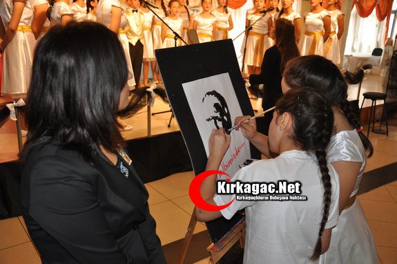 Salonu dolduran yaklaşık 500 kişinin meraklı bakışları içerisinde Atatürk resmini tamamlayan öğrenciler, bu anlamlı eseri Kırkağaç Kaymakamı Ali Sırmalı’ya takdim ettiler.
