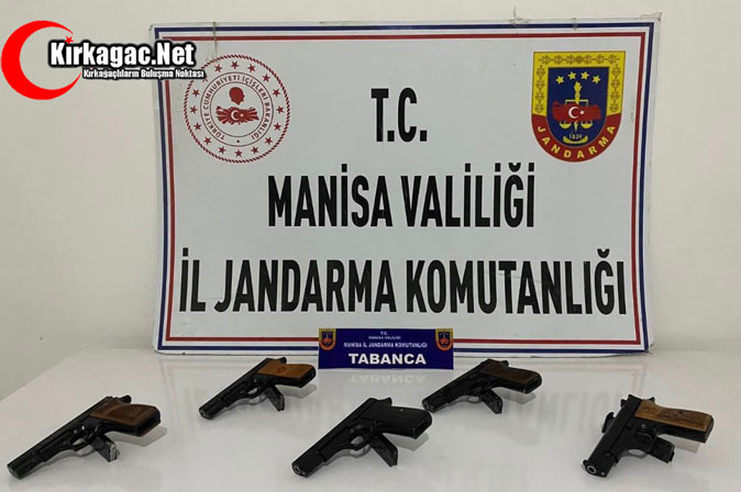 Manisa’nın Şehzadeler İlçesinde O.M.(1958/E) isimli şahsın yasadışı yollarla temin ettiği tabancaları satacağı yönünde bilgiler elde edilmesi üzerine harekete geçen İstihbarat Şube Müdürlüğü ve Yunusemre İlçe Jandarma Komutanlığı'nca yapılan operasyonda 9 adet ruhsatsız Browning Tabanca, 9 adet Tabanca Şarjörü, 278 adet Tabanca Fişeği ele geçirildi.