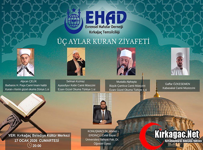 Kısa süre önce ilçemizde kurulan Evrensel Hafızlar Derneği(EHAD) Kırkağaç Temsilciliği 17 Ocak Cumartesi günü “Üç Aylar Kuran Ziyafeti” programı düzenliyor.