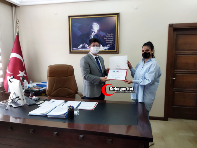 Okul Müdürümüz ve misafirlerimiz Kaymakamız Murat Büyükköse'ye hediyelerini sundular. Kaymakamız Murat Büyükköse projeyi yürüten öğretmen ve misafirlerimize sertifikalarını takdim ettiler.