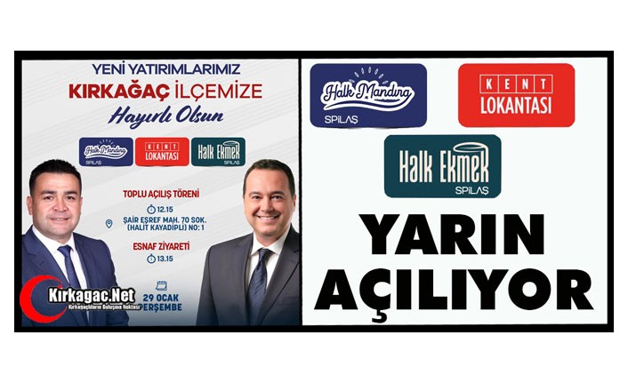 Kırkağaç Belediye Başkanı Üstün Dönmez "Manisa Büyükşehir Belediye Başkanı Besim Dutlu'nun katılımlarıyla 29 Ocak Perşembe günü Kent Lokantası, Halk Mandıra ve Halk Ekmek projelerimizin toplu açılışını gerçekleştirecek, sonrasında da Kırkağaçlı esnafımızla da bir araya geleceğiz.