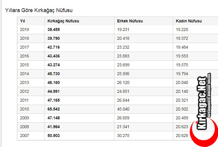 İlçemizin nüfusu geçtiğimiz yıl 39790'dı. Kırkağaç, Manisa'da nüfusu en çok düşen ilçe oldu.Kırkağaç 1331 kişi azaldı.