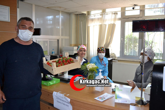 Elleriyle özene bezene yetiştirdiği çilekleri, Kırkağaç Devlet Hastanesine götürerek sağlıkçılaras ve tüm hastane personeline ikram eden duyarlı çiftçi, gönülleri fethetti.