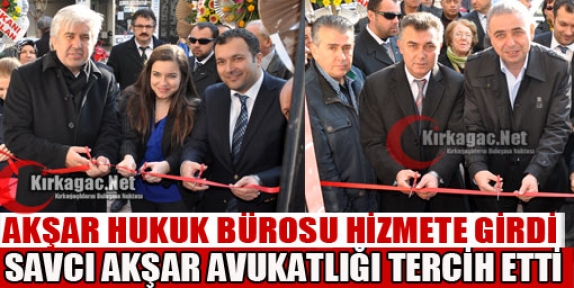 Akhisar Belediye Başkanı Salih Hızlı, CHP Akhisar Belediye Başkan Adayı A.Vehbi Bakırlıoğlu, CHP Kırkağaç İlçe Başkanı Özcan Kaçar, Avukat Sertan ve Selda Akşar'ın birlikte kestiği kurdelenin ardından hizmete giren Akşar Hukuk Bürosu bundan böyle Akhisar'da hizmet verecek.