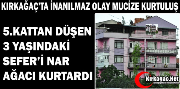 Kırkağaç’ta bugün mucize bir olay yaşandı. Şair Eşref Mahallesi 79 sokak da bulunan Esra Apartmanının 5.katından ikamet eden Kaya ailesinin 3 yaşında ki çocukları Sefer Deniz, evin penceresinden aşağı düştü.
