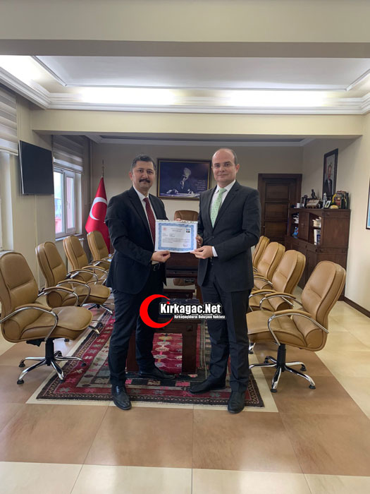 Kırkağaç Kaymakamı Zafer Oktay ve mesai arkadaşları ile vedalaşan Özarslan’a Oktay’dan tarafından takdir belgesi verildi.