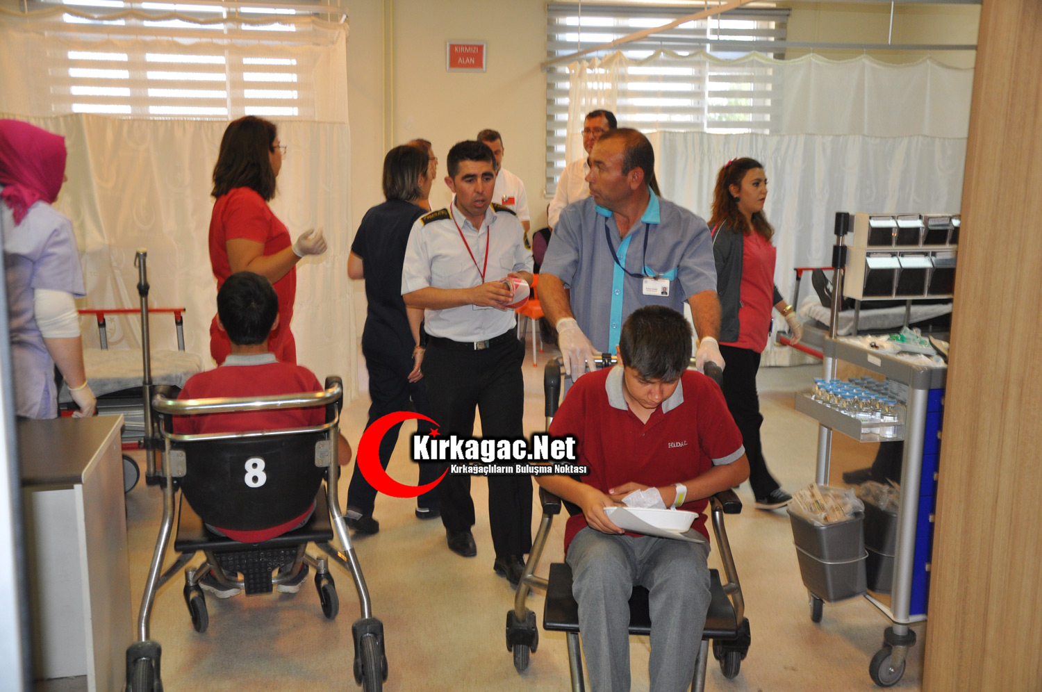 Senaryo gereği kimi ambulanslarla kimi de yaya olmak üzere HİDAL’li 50 öğrenci gıda zehirlenmesi şikayeti ile Kırkağaç Devlet Hastanesine getirildiler.