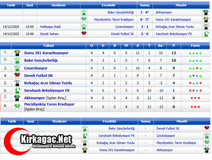 Haftanın diğer maçlarında Develispor, Saruhanlı Belediyespor’u 5-0, Soma 301 Karaelmasspor ise Mecidiyeköy Tarım Kredispor hükmen 3-0 mağlup etti.