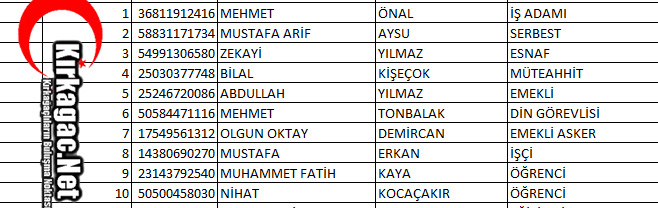 Listenin 2.basamağında Mustafa Arif Aysu, 3.sırada Zekai Yılmaz, 4.sırada Bilal Kişeçok, 5.sırada Abdullah Yılmaz, 6.sırada Mehmet Tonbalak, 7.sırada Olgun Oktay Demircan, 8.sırada Mustafa Erkan, 9.sırada Muhammet Fatih Kaya, 10.sırada Nihat Kocaçakır yer aldılar.