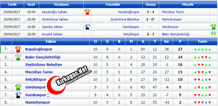Haftanın diğer maçlarında lider Kayalıoğluspor güçlü rakibi Mecidiye Tarım’ı sahasında 3-1’le geçerek zirvedeki yerini korurken, Zeytinliova, Hamidiyespor’u 3-0 mağlup etti.
