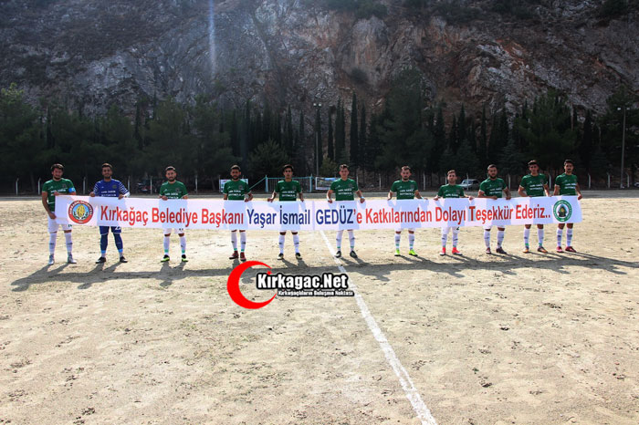 Bakır G.Birliğisporlu oyuncuların sahaya "Kırkağaç Belediye Başkanı Yaşar İsmail Gedüz'e katkılarından dolayı teşekkür ederiz" pankartıyla çıkması dikkat çekti.
