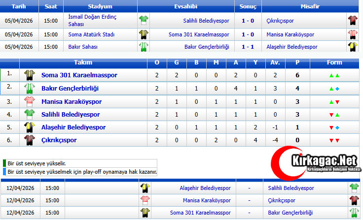 Haftanın diğer maçlarında Soma 301 Karaelmas sahasında Karaköyspor’u, Salihli Belediyespor’da Çıkrıkçıspor’u 1-0’lık sonuçla yenerek haftayı 3’er puanla kapattılar.