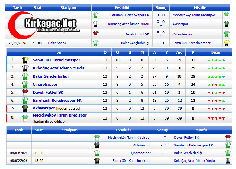 Soma 301 Karaelmasspor ise aldığı bu beraberlikle ligi şampiyon olarak bitirmeyi garantilerken, Bakırspor son haftaya girilirken 2. sıradaki yerini Akhisarspor’u hükmen 3-0 yenen bir diğer temsilcimiz Kırkağaç Acar İdman Yurdu’na kaptırdı.